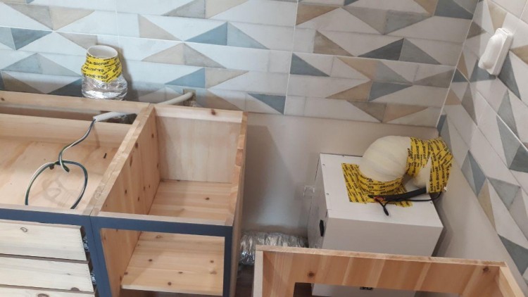 필터박스 설치는 싱크대의 코너 공간을 활용했고 단열배관이 렌지 뒷편 싱크대 뒷선반까지 이어져야해서 뒷선반의 폭을 넓혔습니다.