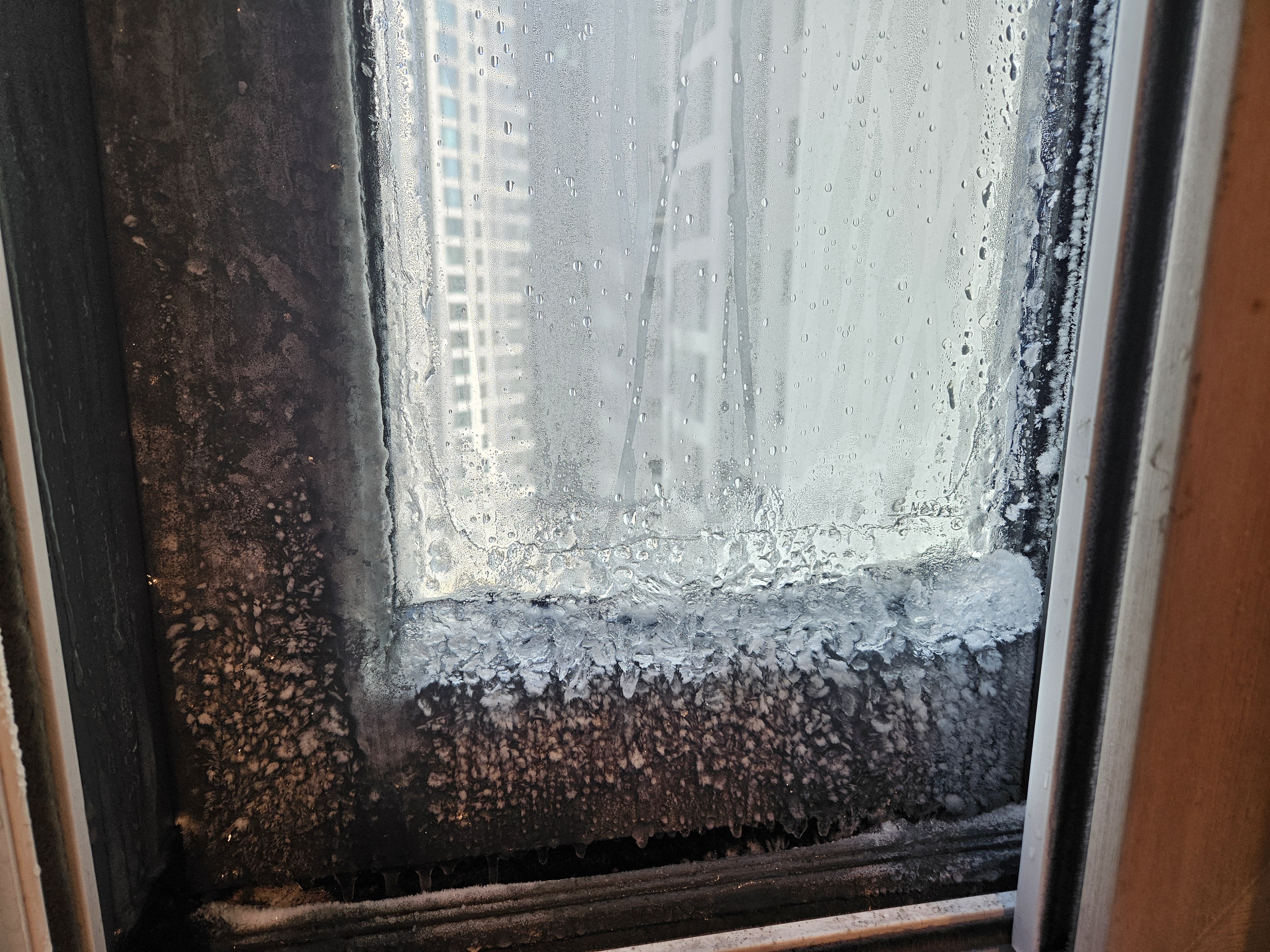 결로가 생기게 되는 상태에서 창문의 성능이 상대적으로 낮다면 그 결로수가 얼 수 있습니다.