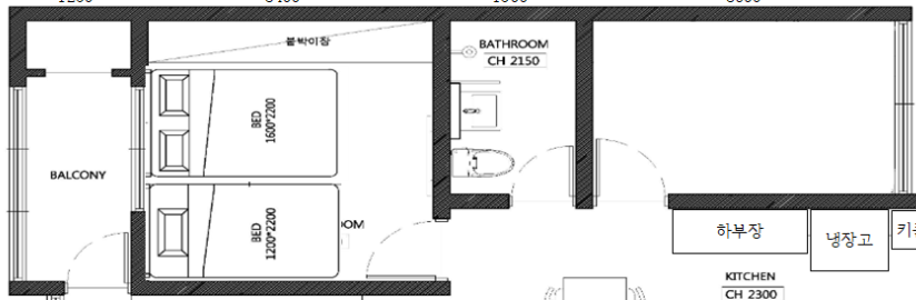 아래 사진은 공동주택의 평면구조인데, 자세히 보면 외기와 면한 쪽에 붙박이 장이 설치되어 있지 않는 것을 볼 수 있다.