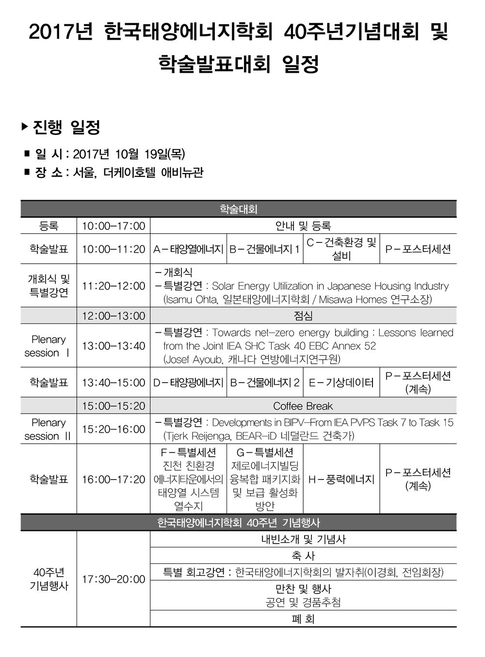 2017년 한국태양에너지학회 40주년기념대회 및 학술발표대회 일정