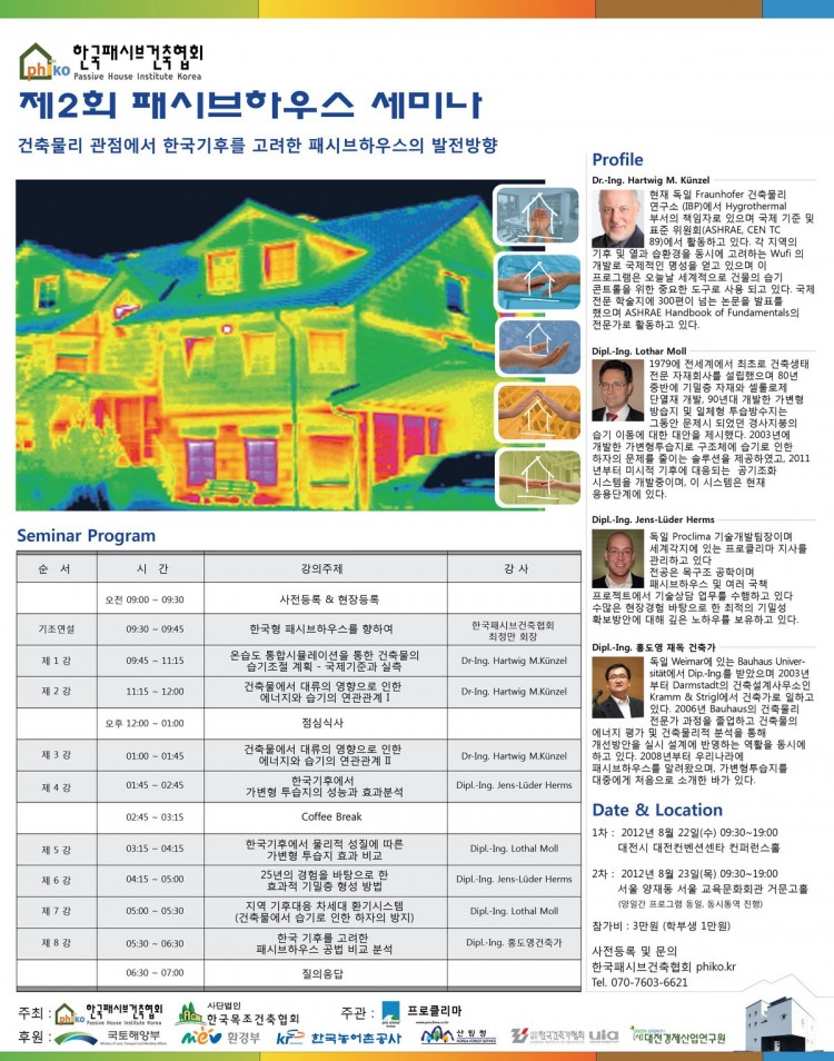 이 번 세미나는 실내 온/습도환경의 세계적인 석학인  Dr.-Ing. Hartwig M. Kunzel 씨를 포함하여 한국기후에 대한 패시브하우스의 적합성과 발전방향을 위주로 발표하게 될 것입니다.